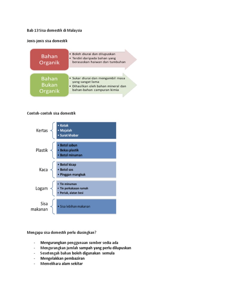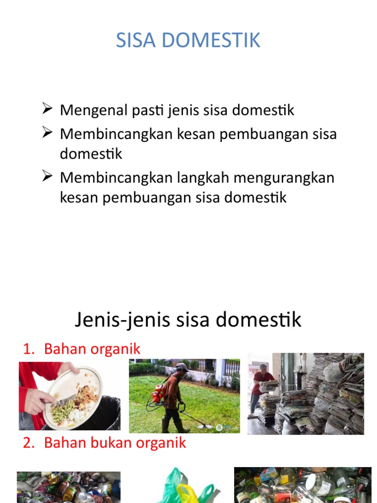 Sisa domestik dapat dikelaskan kepada bahan organik dan bahan bukan organik. I Dihasilkan dari sumber haiwan dan tumbuhan i Dihasilkan dari sumber mineral. Guru meminta murid membincangkan kesan pembuangan sisa domestik di.